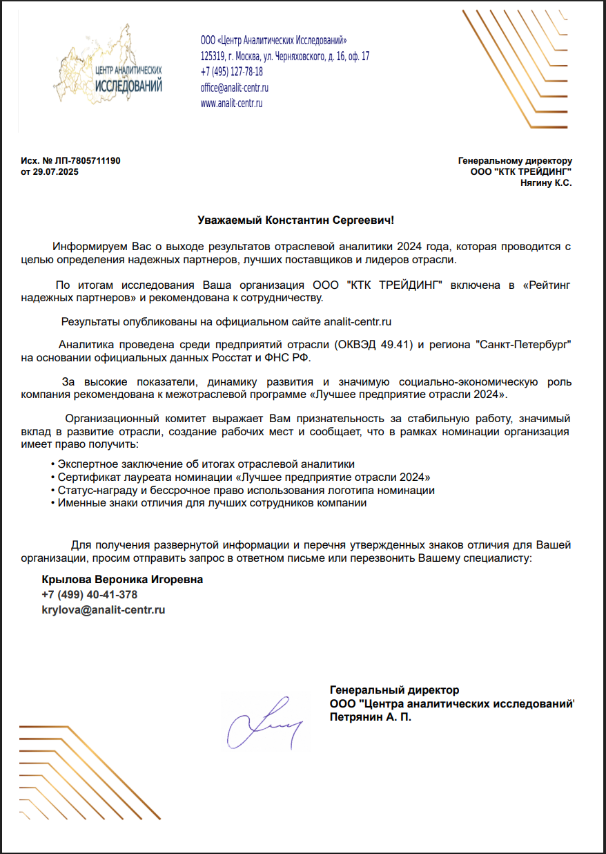 Компания «КТК Трейдинг» удостоена почетного статуса и включена в реестр «Надежных партнеров». Это не просто формальное достижение, а прямое подтверждение нашей безупречной деловой репутации и устойчивой позиции на рынке.